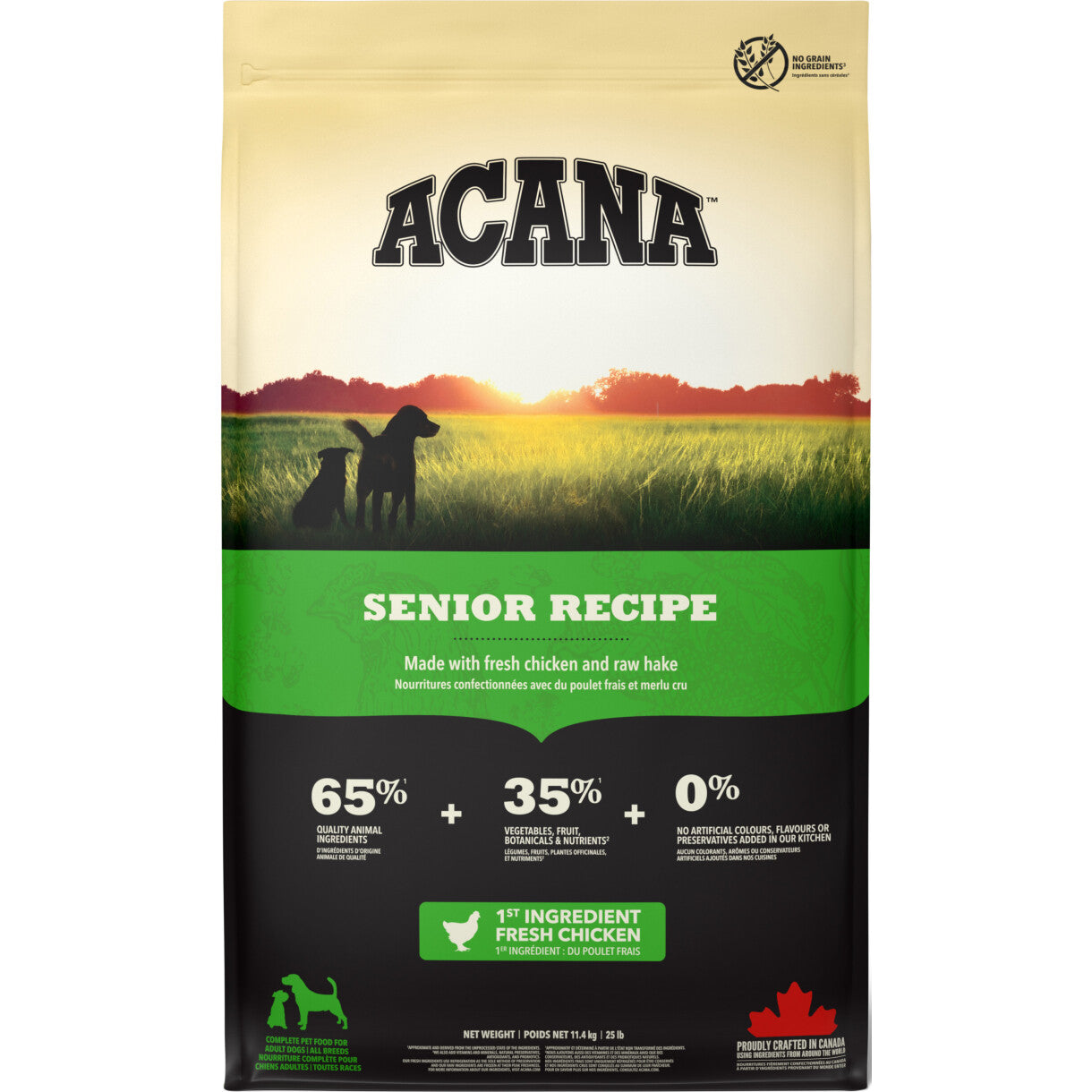 ACANA™ Senior er lavet med proteinrige animalske kvalitetsingredienser, herunder fersk kylling, rå kulmule og frugt og grøntsager, der giver naturlig næring og holder seniorhunde sunde, glade og stærke.