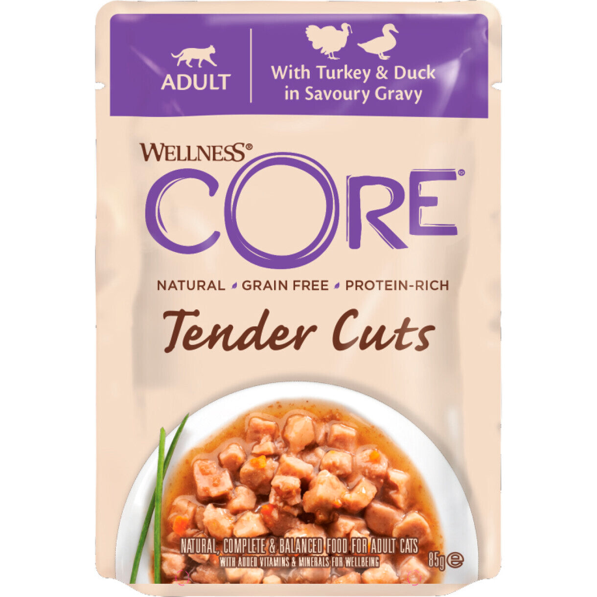 Vores Wellness CORE Tender Cuts med kalkun og and i velsmagende sovs er kornfri naturlige langsomt kogte møre udskæringer af fjerkræ kombineret med sunde grøntsager og frugter serveret i salte saucer, der giver en uimodståelig smag.