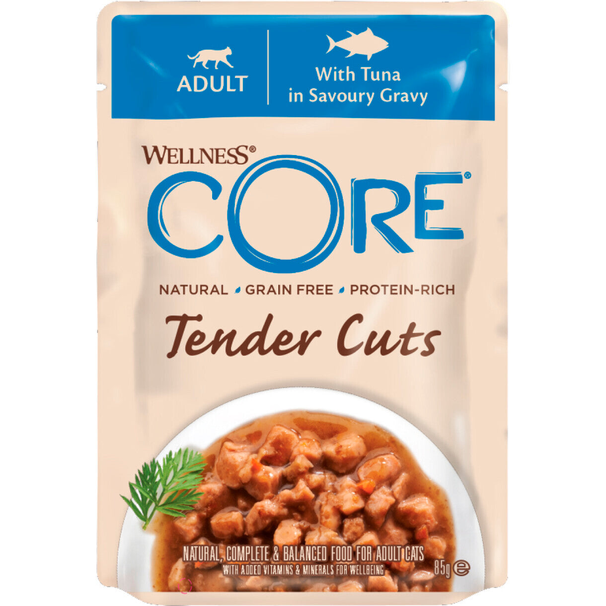 Vores Wellness CORE Tender Cuts med tun i velsmagende sovs er kornfri naturlige langsomt kogte møre udskæringer af fjerkræ kombineret med sunde grøntsager og frugter serveret i salte saucer, der giver en uimodståelig smag.