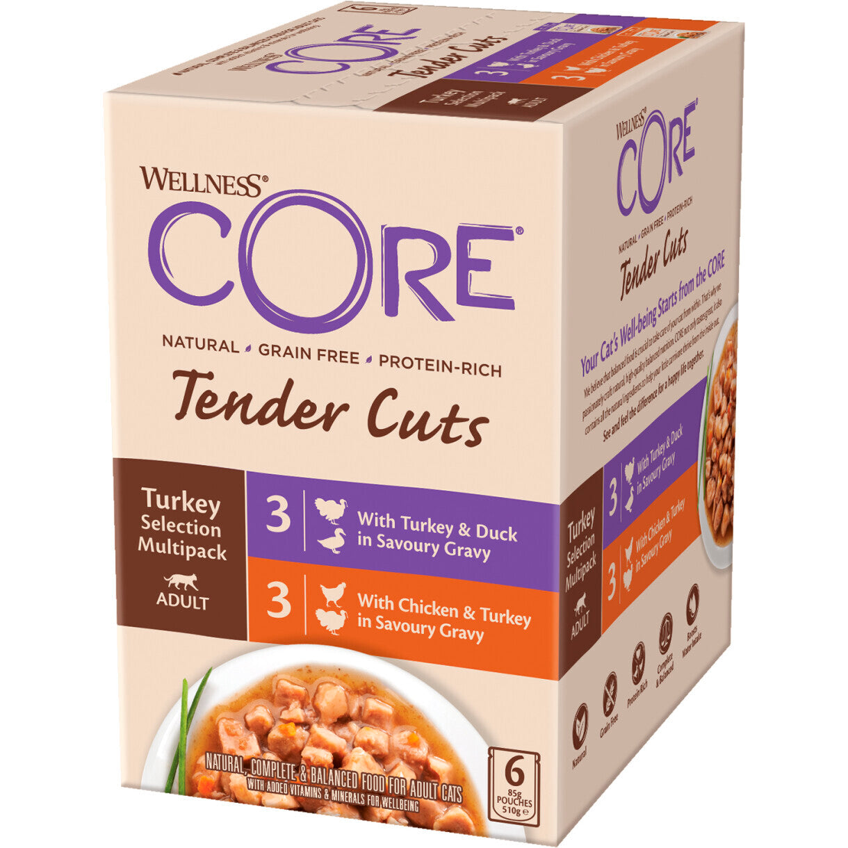 Vores Wellness CORE Tender Cuts Turkey Selection Multipack er kornfri naturlige langsomt kogte møre udskæringer af fjerkræ kombineret med sunde grøntsager og frugter serveret i salte saucer, der giver en uimodståelig smag.