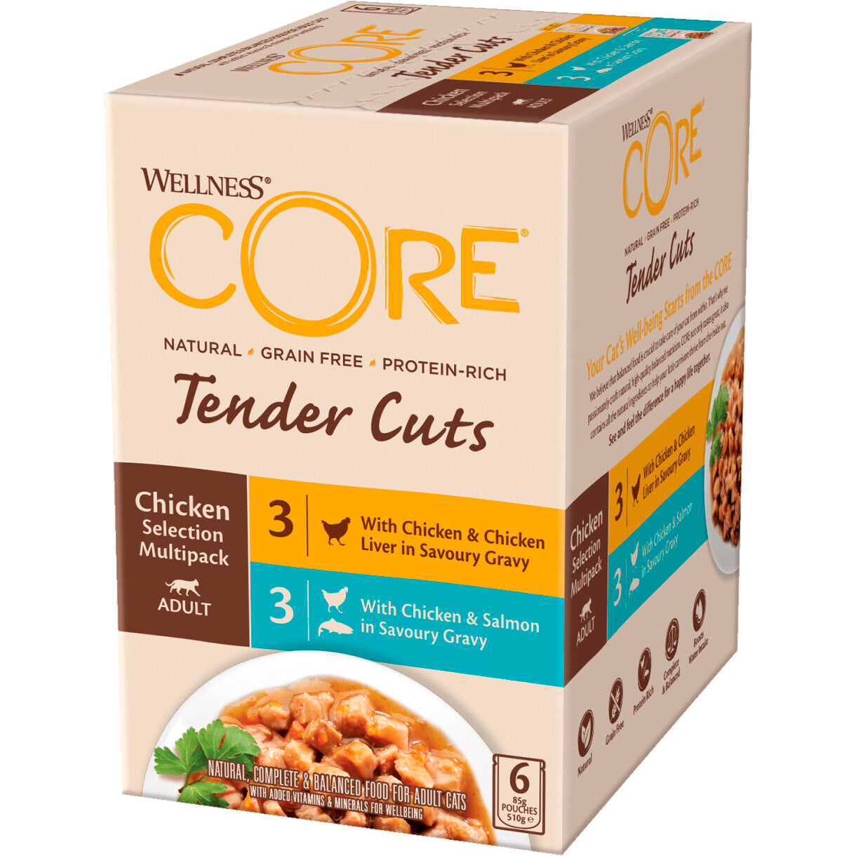 Vores Wellness CORE Tender Cuts Chicken Selection Multipack er kornfri naturlige langsomt kogte møre udskæringer af fjerkræ kombineret med sunde grøntsager og frugter serveret i salte saucer, der giver en uimodståelig smag.