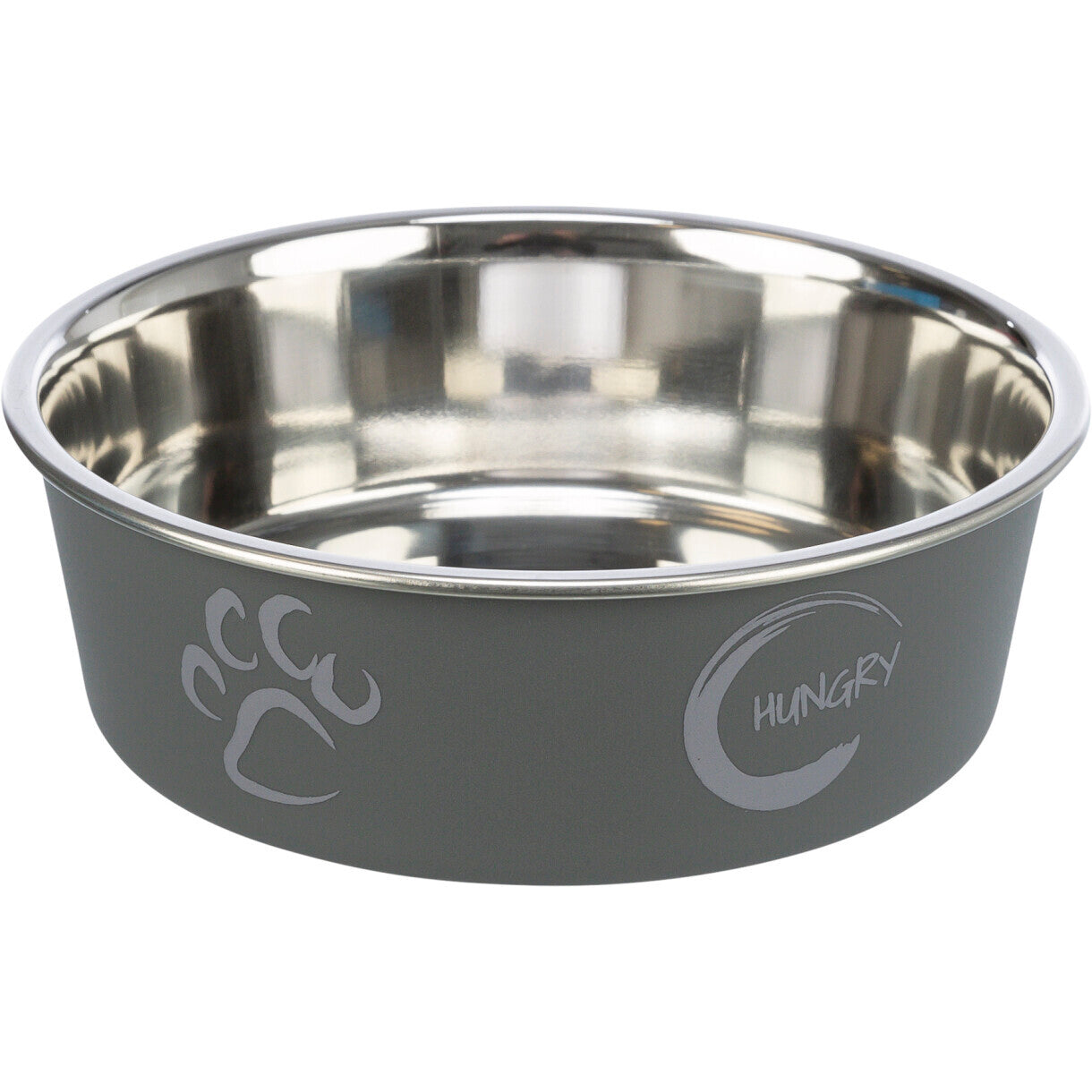 Dette produkt er en skål fremstillet af rustfrit stål med en plastbelægning. Den har en kapacitet på 0,25 liter og en diameter på 12 cm. Skålen kommer i forskellige farver og med forskellige motiver. Den er udstyret med en gummiring, der gør den skridsikker og forhindrer den i at glide rundt, når dit kæledyr spiser eller drikker fra den. Denne skål er ideel til daglig brug til fodring af dit kæledyr, og den er let at rengøre og vedligeholde.