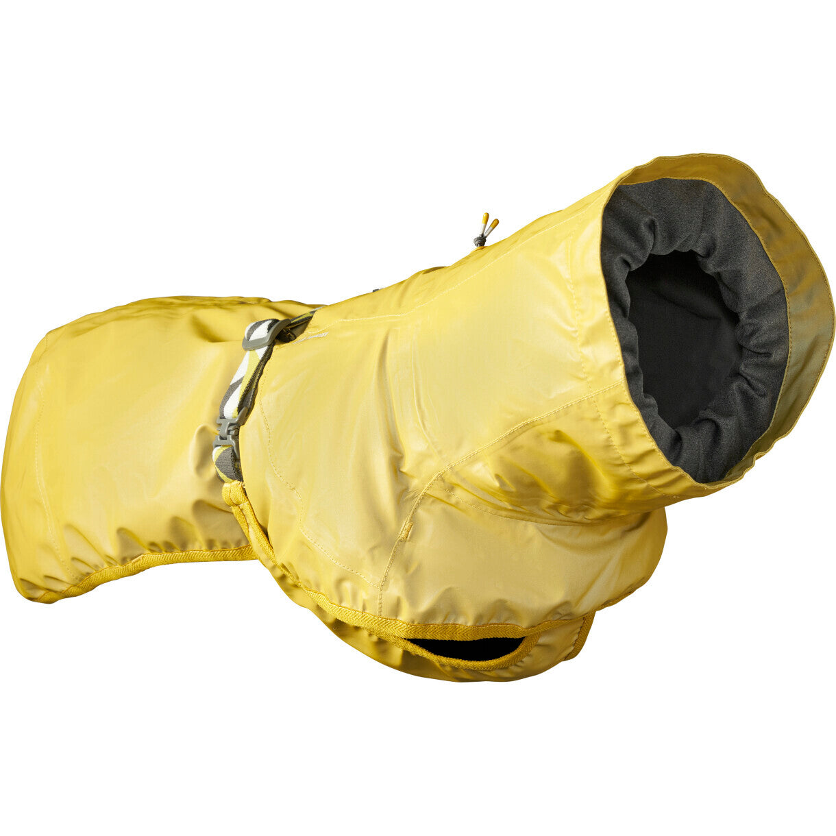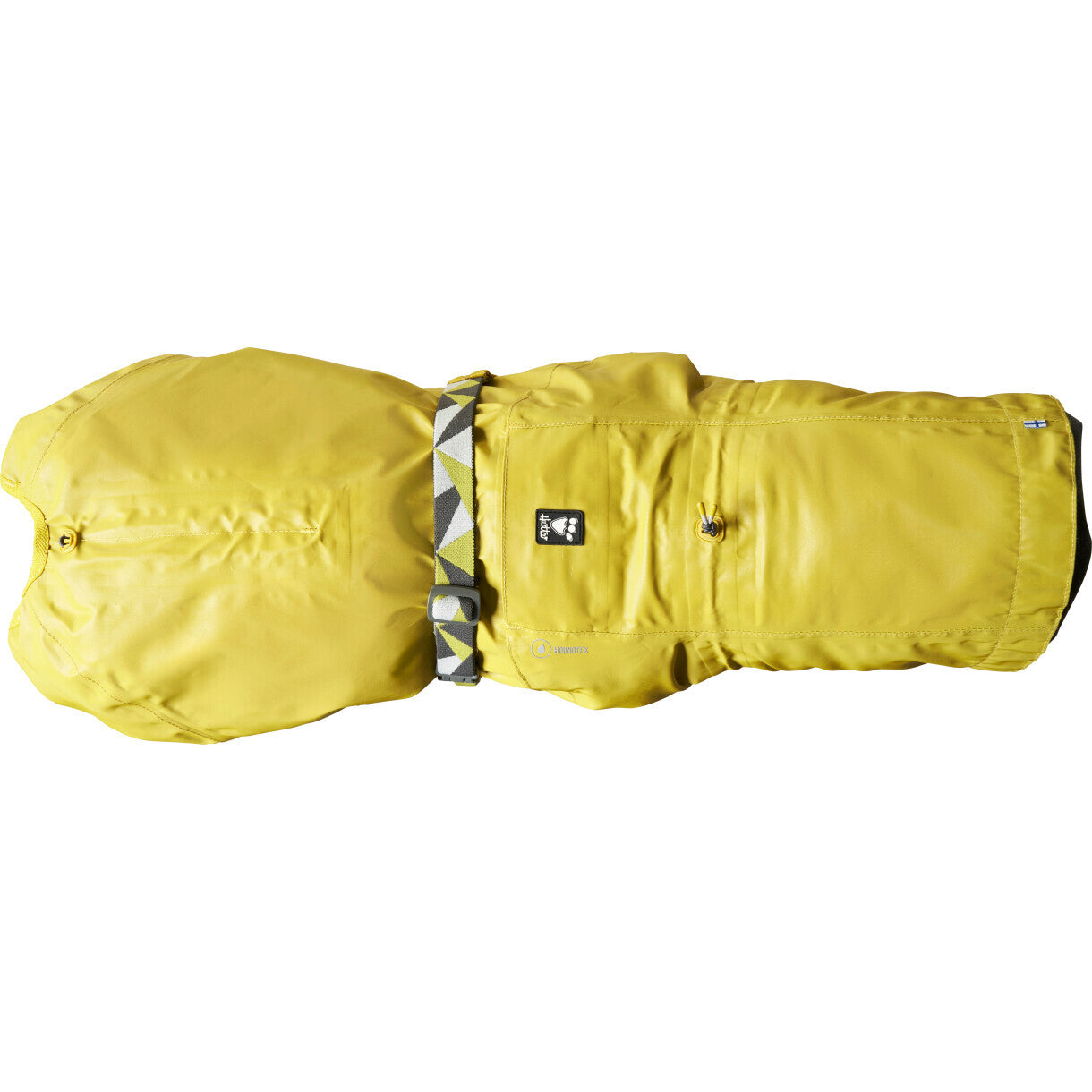 • Denne tynde regnfrakke til hunde har ikke et stoffor, men den er lamineret med et blødt, glat materiale. Ud over det stærkt reflekterende overfladestof er vandtætningen nøje overvejet i jakkens design. Jakken har en åbning i snore, der kan lukkes med et klik for at forhindre vandet i at løbe ned ad hundens ryg. Og regnfrakken har fuldt tapede sømme, hvilket gør den virkelig vandtæt og klar til regnfulde dages eventyr.