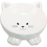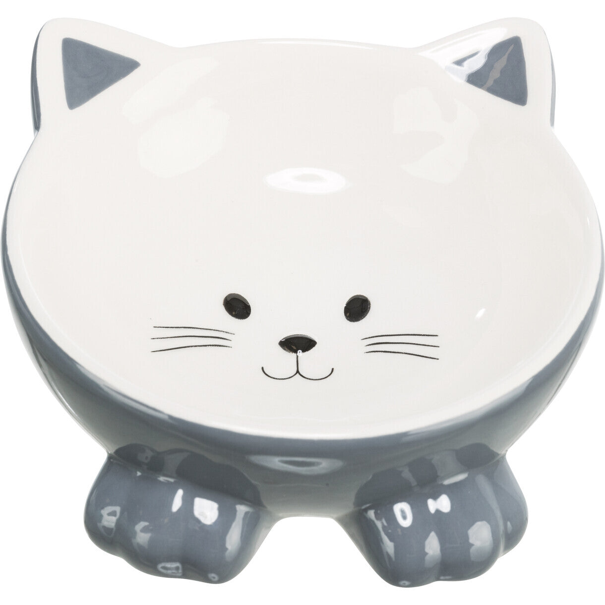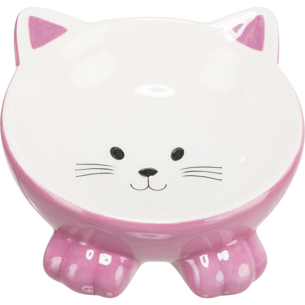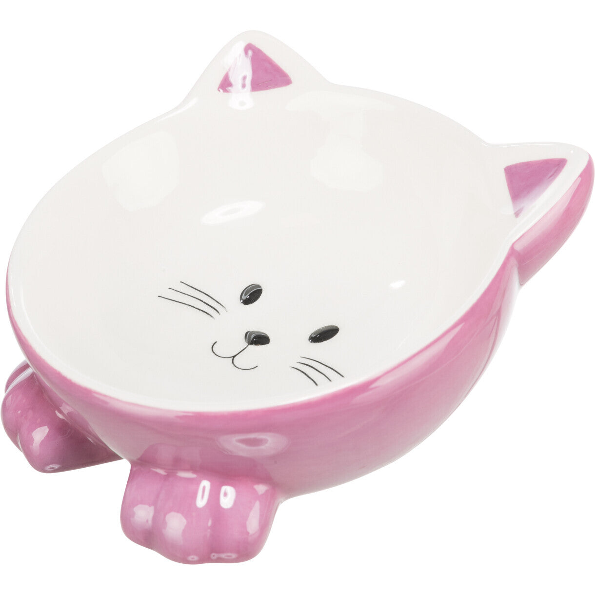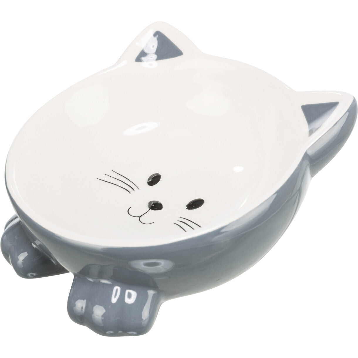Sød keramikskål formet som et katte hoved med farvede øre og katte ansigt nede i skålen.
