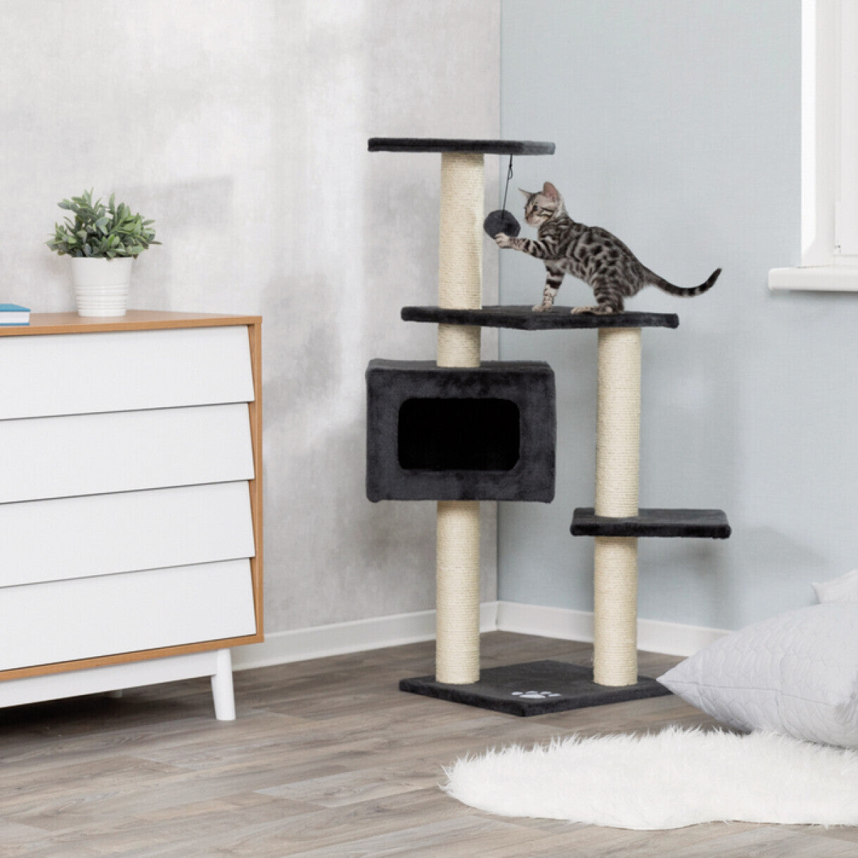 Kattemiljøet Palamos, med en højde på 113 cm, tilbyder en omfattende og underholdende plads til din kat. De talrige kradsestolper af sisal opfylder kattens naturlige kradseinstinkter, mens liggepladserne betrukket med plysbetræk giver komfortable hvileområder. En hyggehule, overdækket med blødt plys, skaber et trygt gemmested til din kat. Yderligere leg og stimulering tilføjes med en plys bold, der hænger fra øverste etage. Kattemiljøet Palamos er ikke kun praktisk til kradse- og hvilebehov, men også sjovt og alsidigt, hvilket gør det til en ideel tilføjelse til dit hjem.