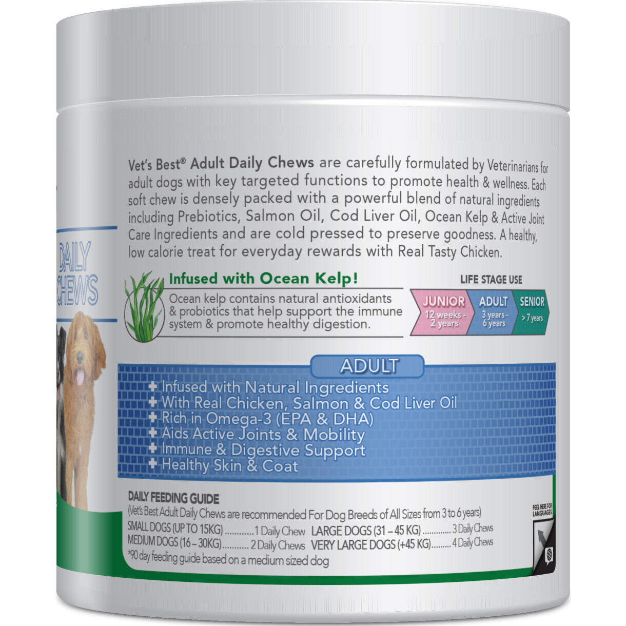 Vet's Best Adult Daily chews er nøje sammensat af dyrlæger til voksne hunde (3-6 år), med fokus på nøglefunktioner, der fremmer sundhed og velvære.