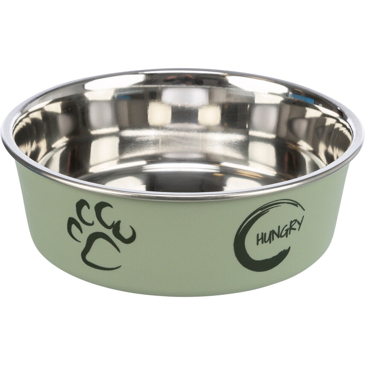 Denne skål er lavet af en kombination af rustfrit stål og plast. Skålen har en plastbelægning, der giver et farverigt og dekorativt udseende samt beskytter mod ridser og skrammer. Den er designet med en skridsikker gummiring i bunden, hvilket forhindrer skålen i at glide eller skride under brug, hvilket gør den mere stabil. Derudover findes skålen i forskellige motiver, der tilføjer et personligt præg til din kæledyrs madoplevelse.