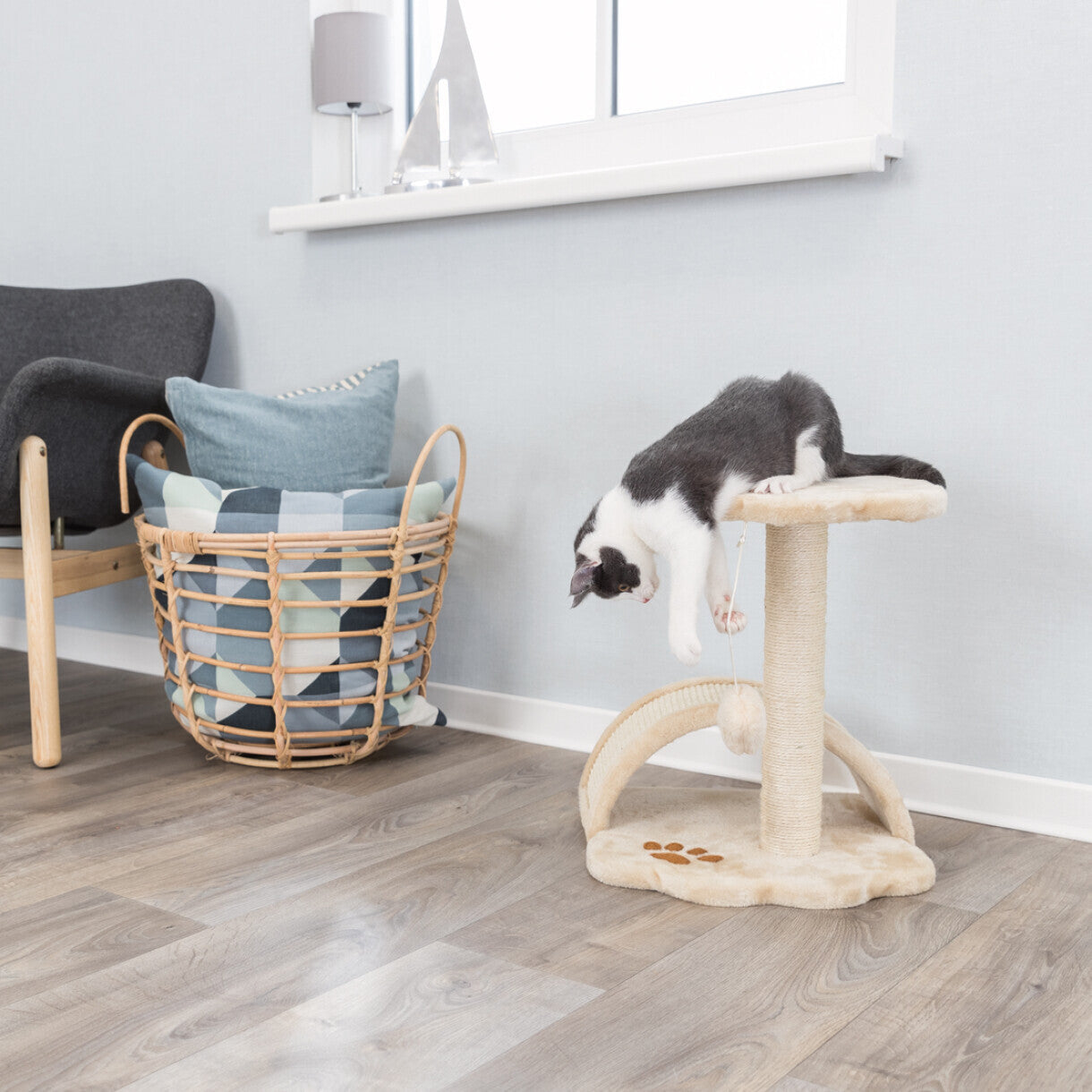 Kradsetræet Vitoria med en højde på 50 cm er en kompakt og funktionel struktur til din kat. Det har en sisalstamme, der opfylder kattens kradsebehov, og en plysliggeplads, der tilbyder en komfortabel hvileplads. En legetøjsbold i plys på elastik giver ekstra underholdning. Den lille bro med en kradseoverflade skaber en form for hule og tilføjer en ekstra dimension til kradsetræet. Vitoria kradsetræet er ideelt til mindre rum og giver din kat et optimalt sted til både leg, hvile og kradseaktiviteter.
