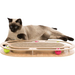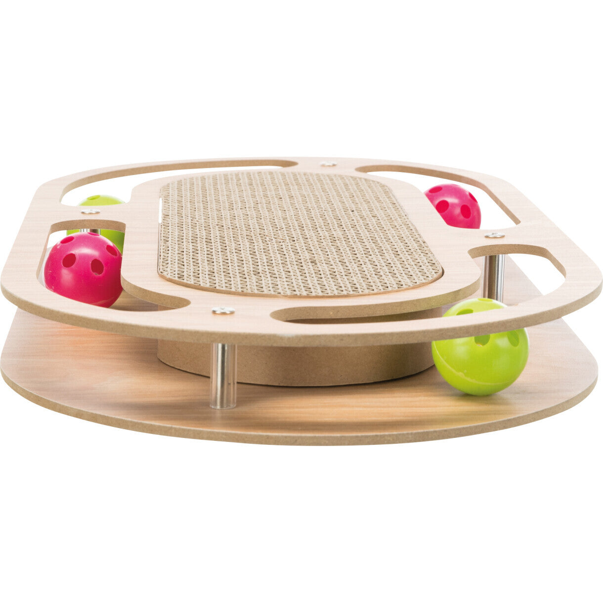 Denne kradseplade i pap er det perfekte tilbehør til din kat, der elsker at kradse og lege. Den giver din kat mulighed for at tilfredsstille sine naturlige kradseinstinkter. Kradsepladen er lavet af MDF, hvilket gør den holdbar og modstandsdygtig over for ridser og slid. Den er også udstyret med fire legetøjsbolde af plast, der vil holde din kat underholdt i timevis. Disse bolde kan nemt fjernes og udskiftes, så du kan variere legetøjet og holde din kat interesseret.