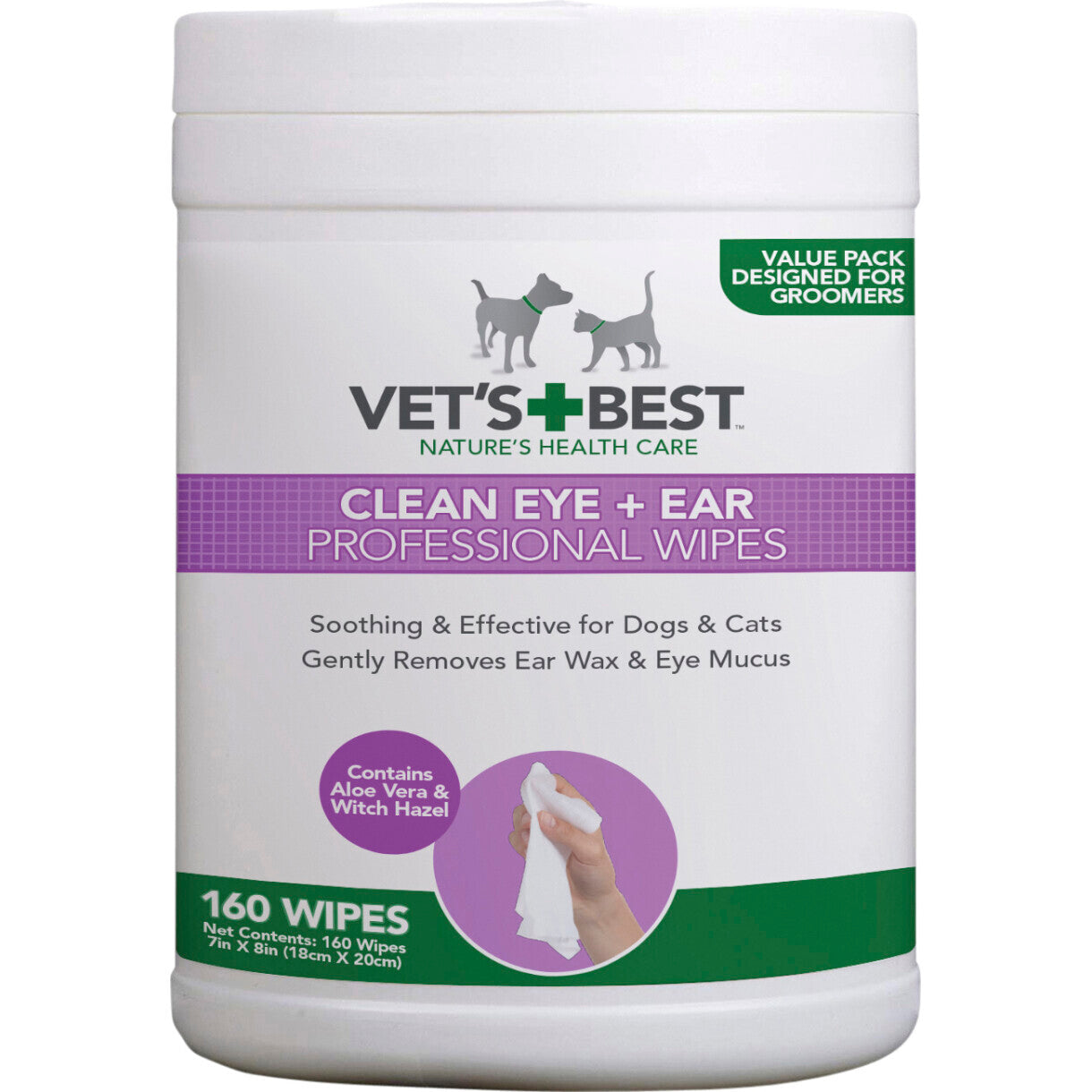 Vet's Best professionelle øjen- og øreservietter er velegnede til både katte og hunde, indeholder aloe vera og troldnød, hvilket gør dem til en beroligende og blid måde at fjerne ørevoks og øjenslim på.