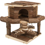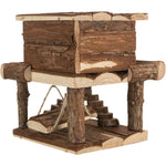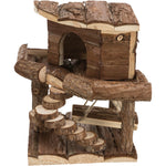Dette hamsterhus er et unikt tilflugtssted med et aftageligt hus, der letter rengøringen. Lavet af nåletræ med bark, tilbyder huset en autentisk oplevelse for din hamster. Udstyret med en gynge og trapper tilbyder det legende elementer til underholdning. Vi prioriterer sikkerhed ved at bruge nåletræ uden harpikskanaler, da harpiks kan være giftigt. Træet undergår en grundig tørreproces for at sikre, at det ikke frigiver harpiks, og limen, der anvendes, er ugiftig og består af en sikker kautsjuk- og celluloseblanding. Skab en tryg og stimulerende levestil for din hamster med vores særlige hamsterhus.