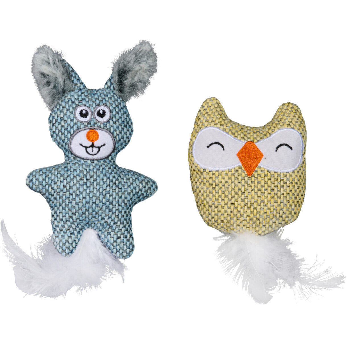 Kaninen og uglen er to charmerende plyslegetøjsfigurer fyldt med katnip, en duftende plante, der tiltrækker og glæder katte. Disse legetøjsdyr er designet til at stimulere kattens naturlige instinkter og give dem en sjov og underholdende oplevelse. Plyslegetøjet er blødt og hyggeligt, hvilket også giver komfort under hviletider.