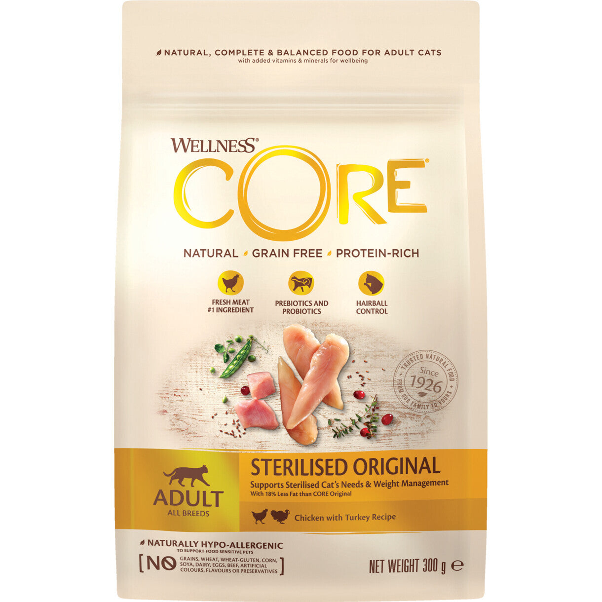 Wellness CORE Sterilised Original med kylling og kalkun er specielt udviklet til at opfylde behovene hos steriliserede eller kastrerede katte, som kan være mindre aktive i voksenlivet.
