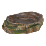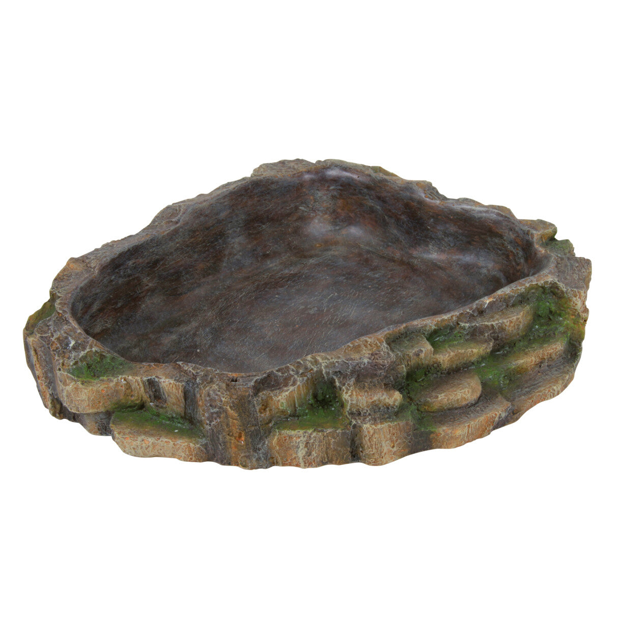 Vand- og foderskålen er lavet af polyesterharpiks, et sikkert materiale i forhold til kontakt med fødevarer. Den præsenterer et naturligt look med regnskovsdekoration, der tilføjer et æstetisk element til terrariet. Skålene har en glat inderside, der gør rengøring nem og bekvem. Dette gør dem ideelle til at opfylde vand- og foderbehovene hos krybdyr og andre små dyr, samtidig med at de tilføjer en dekorativ dimension til deres miljø.