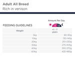 Ferskfrosset vildt (19%), tørret kylling og kalkun (19% inkl. 11%, en naturlig kilde til glucosamin, chondroitin og taurin), kartoffel, hele ærter, fjerkræfedt, sød kartoffel (8%), tørret roepulp (3,5%), kyllingesovs, tørret ølgær, tørret helæg, natriumhexametaphosphat (0,33%), hørfrø, fructooligosaccharider (0,25%, et naturligt præbiotikum).