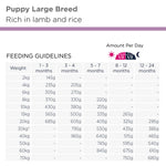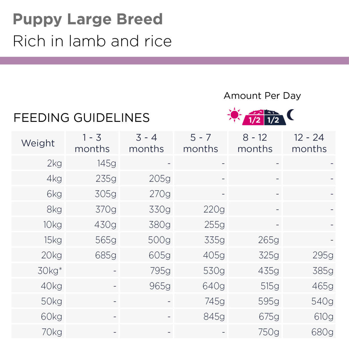Foderet er 100% komplet og afbalanceret. Med masser af lam og ris er Eukanuba ideel til at opforstre hvalpe af store racer som schæferhunde, labradorer, rottweilere og golden retrievere.