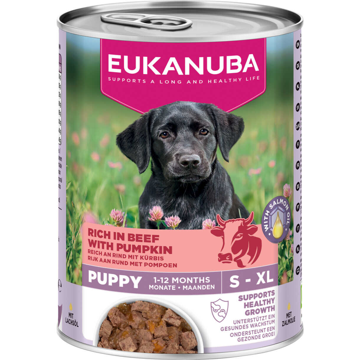Fri for kunstige farver, smagsstoffer og konserveringsmidler er dette komplette og afbalancerede foder perfekt til hvalpe af alle racer og størrelser. Det kan serveres alene eller blandes med EUKANUBA tørfoder for en velsmagende og næringsrig fest.