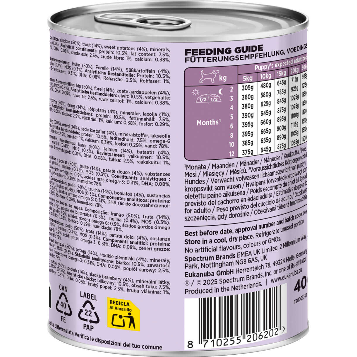 Fri for kunstige farver, smagsstoffer og konserveringsmidler er dette komplette og afbalancerede foder perfekt til hvalpe af alle racer og størrelser. Det kan serveres alene eller blandes med EUKANUBA tørfoder for en velsmagende og næringsrig fest.