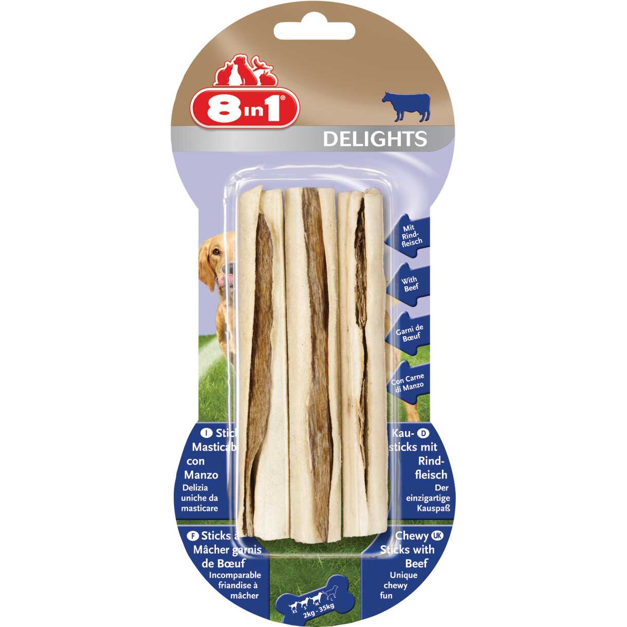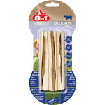 8in1 Delights Beef Bones er lavet af velsmagende oksehud og lækkert oksekød og sikrer intensiv, langvarig tyggesjov til hunden. Denne snack holder din hund beskæftiget, samtidig med at den forbedrer tandplejen. På grund af den naturlige slibende virkning ved tygning fjernes tandsten fra din hunds tænder, og på den måde understøtter knoglerne din hunds tandsundhed. De fedtfattige 8in1 Delights Beef Bones fungerer perfekt som en mundvandsfremkaldende belønning til din hund. De er rige på proteiner og fri for kunstige farvestoffer og smagsforstærkere. Desuden er der hverken tilsat GMO'er eller gluten til de ovnbagte tyggeben.