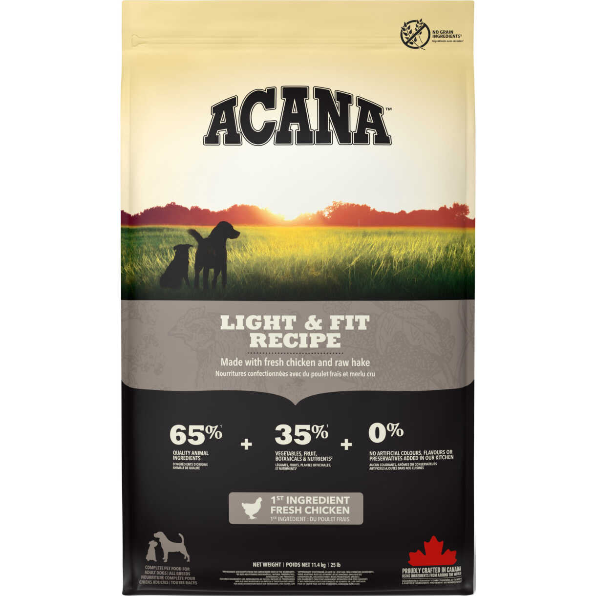 ACANA™ Light & Fit er fyldt med proteinrige animalske ingredienser, herunder fersk kylling, rå kulmule og frugt og grøntsager, som din hund har brug for til at forblive glad, sund og stærk, samtidig med at den holder vægten. Disse kibbles hjælper med at give fuld støtte til immunforsvaret, en sund fordøjelse samt en sund hud og pels. De indeholder kun kvalitetsingredienser og ingen korn, kunstige smagsstoffer, farver eller konserveringsmidler.