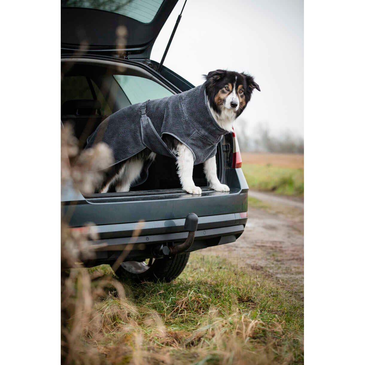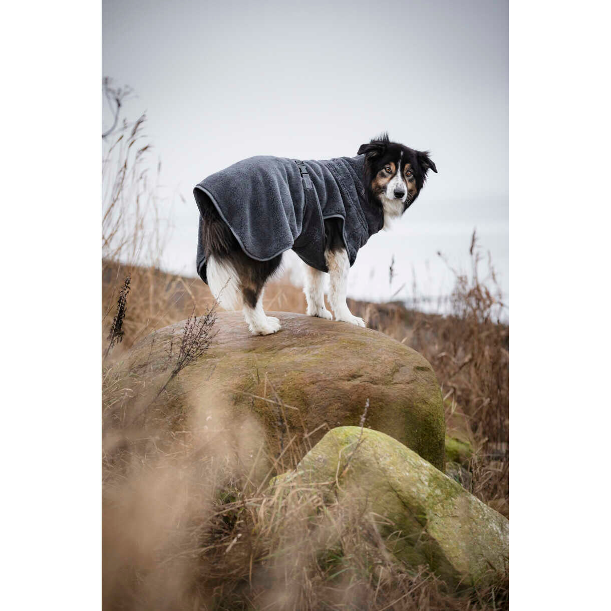 Yderst absorberende hundetæppe med en blød og lækker tekstur. En foldbar krave med høj hals gør det tilpasningsvenligt til hunde med kortere og længere halse. Et justerbart mavebælte giver maksimal dækning og kropstørring. Nyttigt for de langhårede racer.
