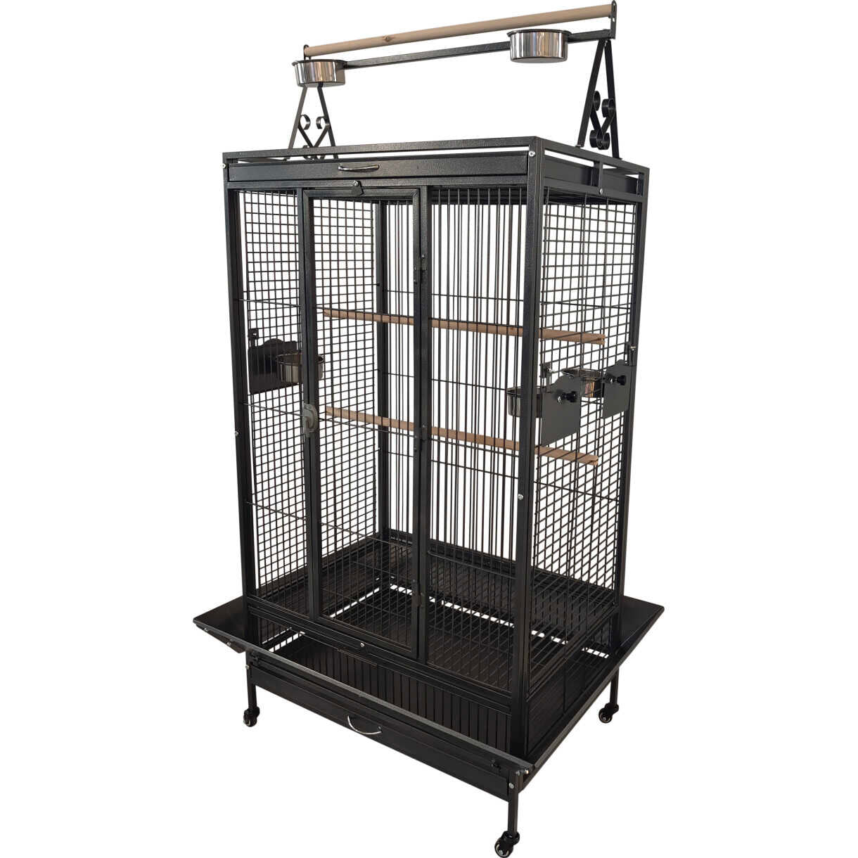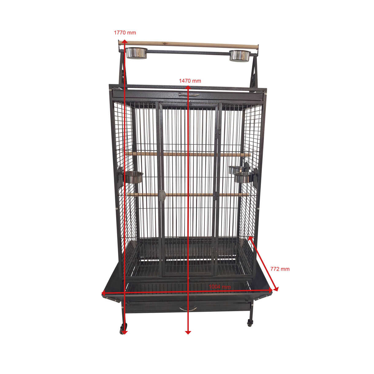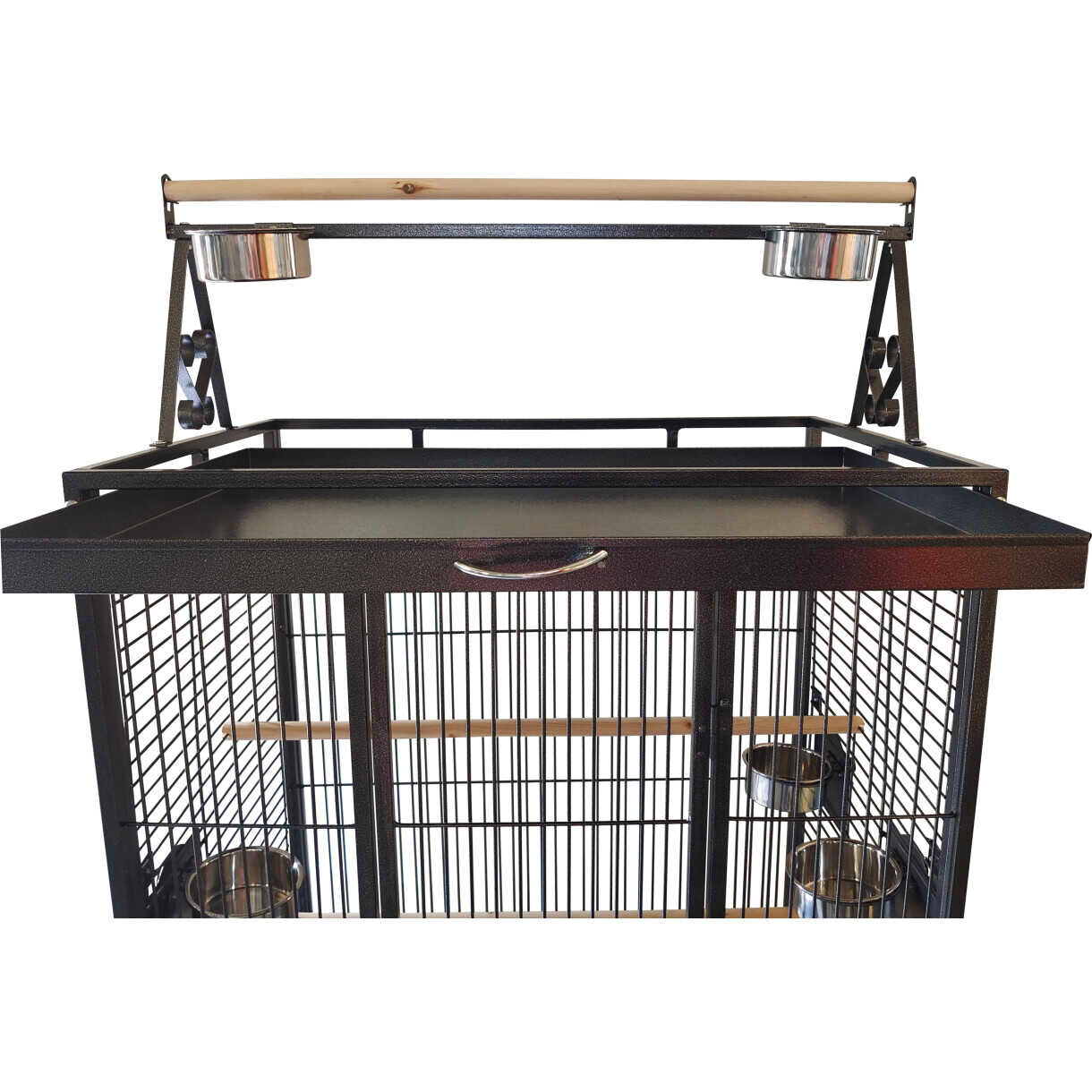 Et funktionelt og solidt bur med integreret legeplads på toppen – perfekt til aktive papegøjer. Leveres med fem rustfri stålskåle og tre siddepinde, som giver god variation og stimulering i hverdagen. Den tætte ståltrådsafstand og kraftige konstruktion sikrer både tryghed og holdbarhed.