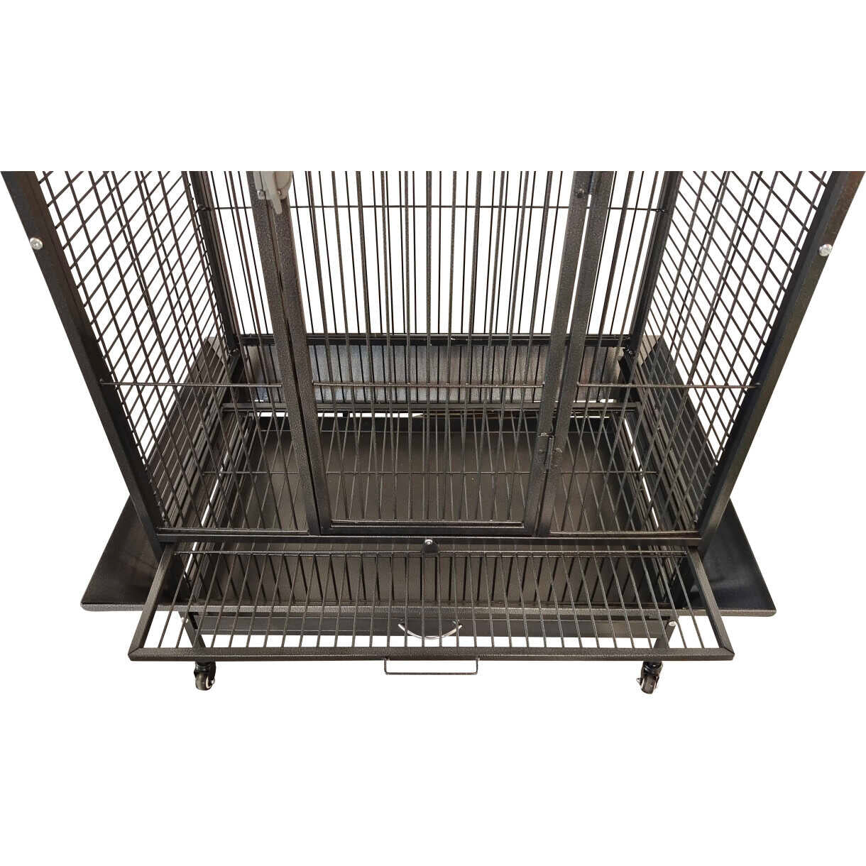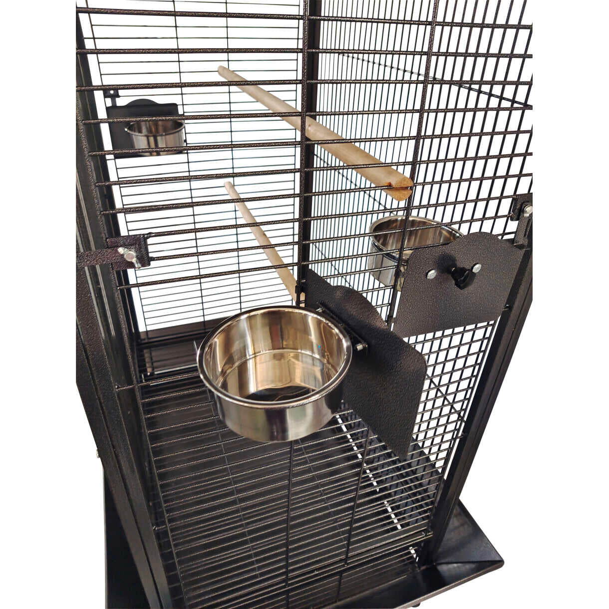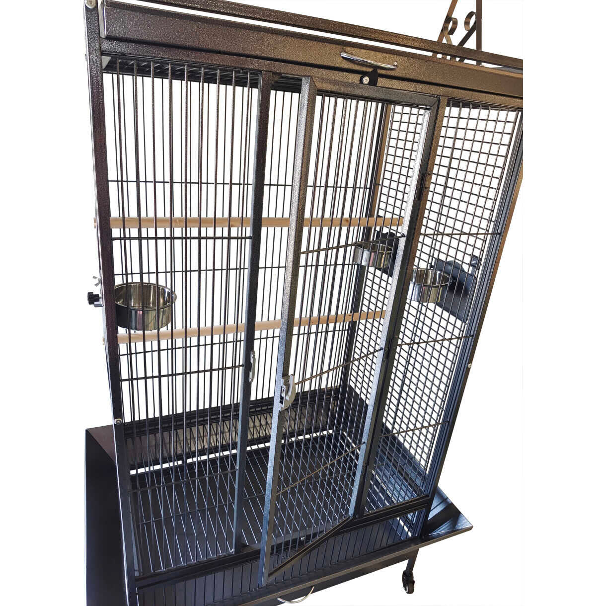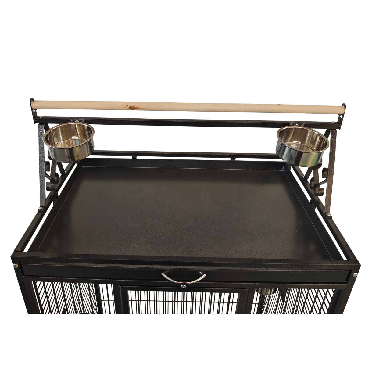 Et funktionelt og solidt bur med integreret legeplads på toppen – perfekt til aktive papegøjer. Leveres med fem rustfri stålskåle og tre siddepinde, som giver god variation og stimulering i hverdagen. Den tætte ståltrådsafstand og kraftige konstruktion sikrer både tryghed og holdbarhed.