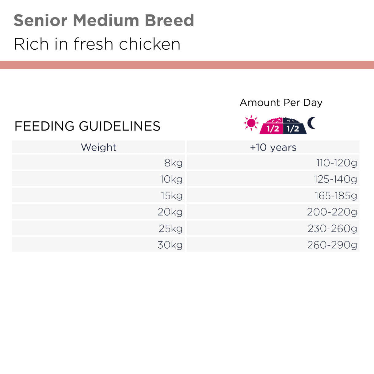 Foderet er 100% komplet og afbalanceret. Avanceret ernæring til ældre hunde af mellemstore racer for at opfylde deres særlige ernæringsmæssige behov.