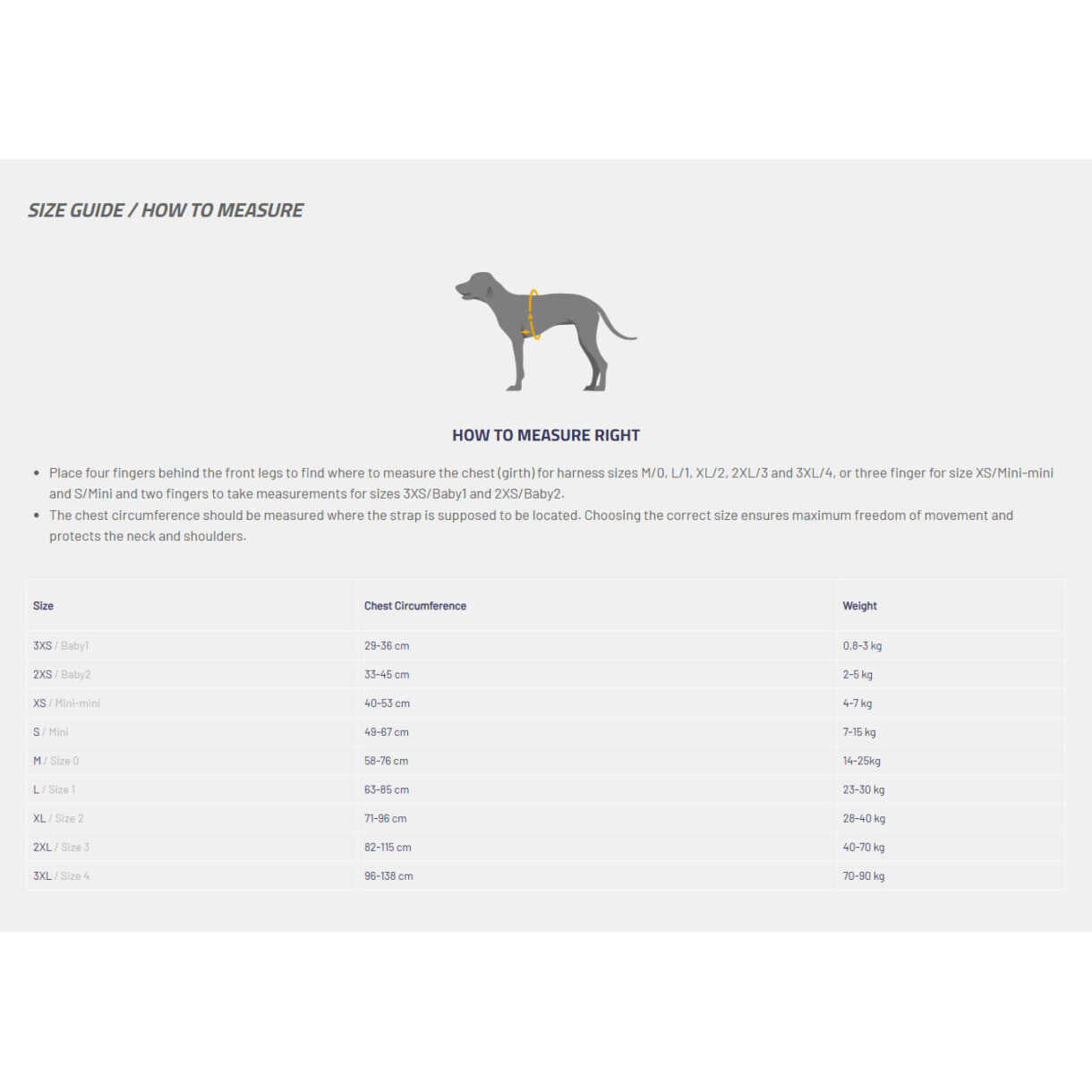 Det er vigtigt at måle din hund grundigt, for at vælge den rigtige selestørrelse. Placer fire fingre bag forbenene for at bestemme, hvor brystet (omkredsen) skal måles for selestørrelserne 0, 1, 2, 3 og 4, tre fingre for størrelserne Mini-mini og Mini og to fingre for størrelserne Baby 1 og Baby 2.
