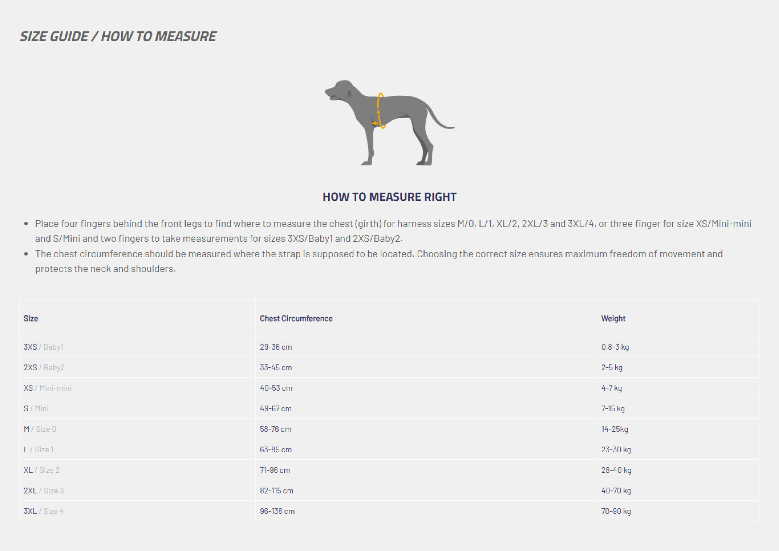 Det er vigtigt at måle din hund grundigt, for at vælge den rigtige selestørrelse. Placer fire fingre bag forbenene for at bestemme, hvor brystet (omkredsen) skal måles for selestørrelserne 0, 1, 2, 3 og 4, tre fingre for størrelserne Mini-mini og Mini og to fingre for størrelserne Baby 1 og Baby 2.