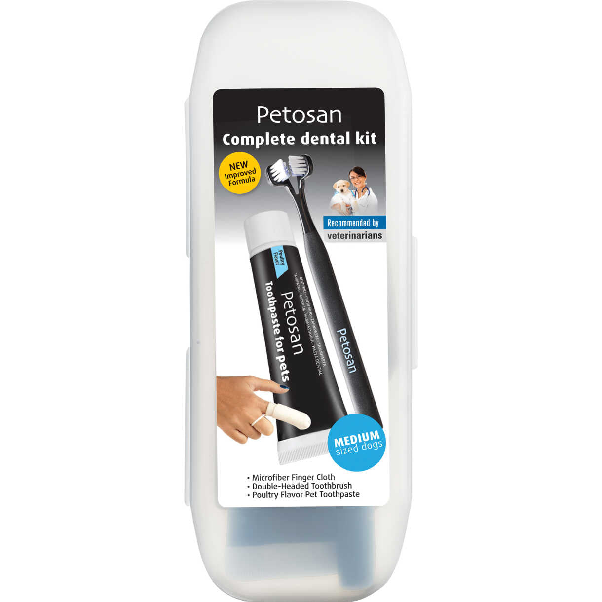 Petosan Complete Dental Kit tilbyder alt hvad du har brug for til at opretholde en sund mundhygiejne til din hund. Dette ultimative sæt kommer i et smart etui og indeholder en række værktøjer til effektiv tandpleje. Med en dobbeltsidet tandbørste og en fingertandbørste i microfiber får du mulighed for at nå alle områder af hundens mund, og den medfølgende tandpasta med lækker kyllingesmag gør tandbørstning til en behagelig oplevelse. Uanset om din hund er lille, mellemstor eller stor, fås dette kit i størrelser, der passer til enhver race, så du kan sikre din hunds mundhygiejne på en nem og bekvem måde.