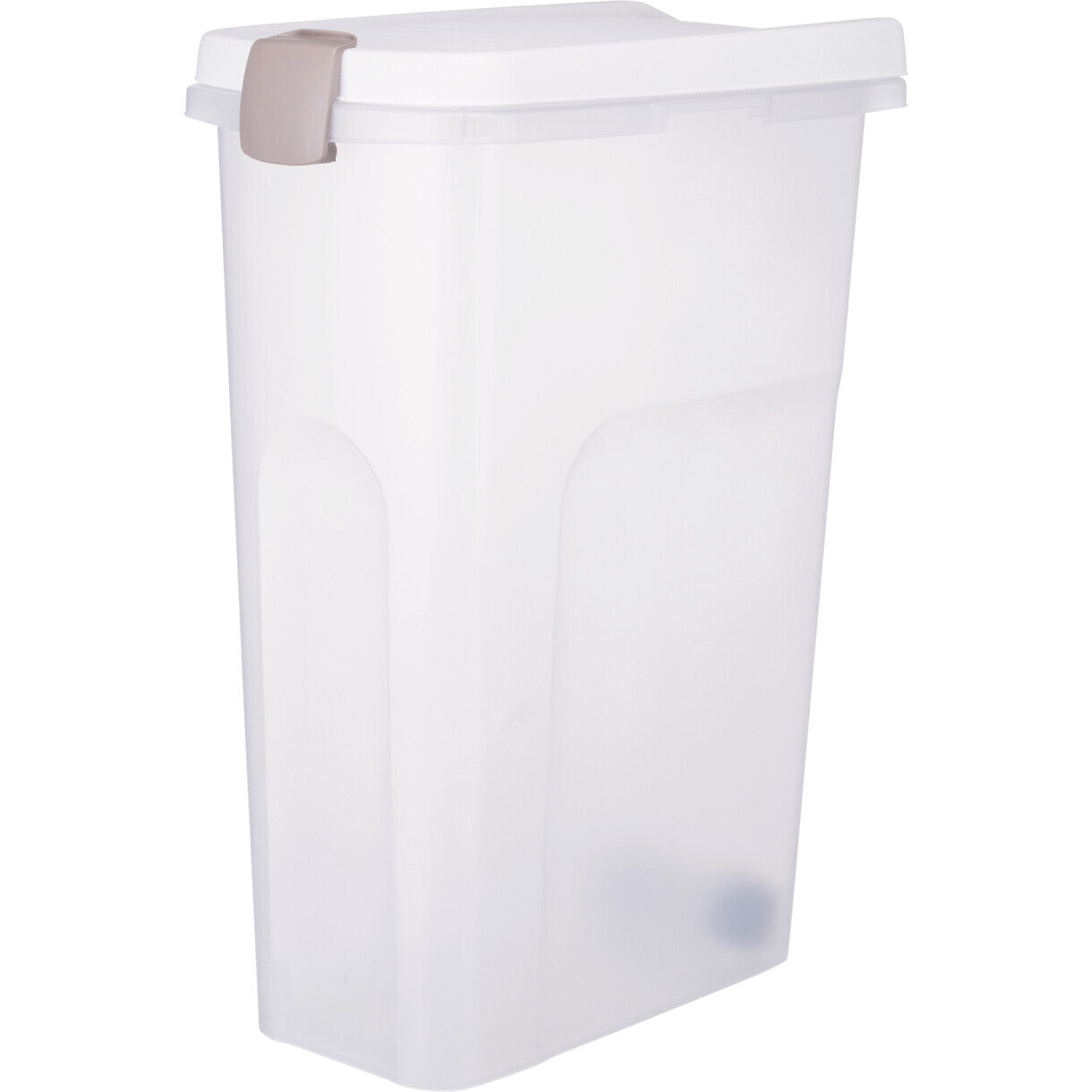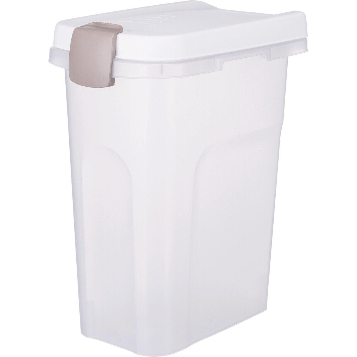 Denne fodertønde i transparent og hvid farve er en lufttæt beholder designet til opbevaring af tørfoder og lignende produkter. Den sikrer, at foderet forbliver friskt og beskytter det mod fugt og luftens påvirkninger, hvilket bidrager til at forlænge holdbarheden. En praktisk kobling giver mulighed for at sammenkoble flere fodertønder, hvilket kan være nyttigt til organisering og opbevaring af større mængder foder.  Fodertønden er fremstillet af plast, hvilket gør den let at rengøre og vedligeholde.
