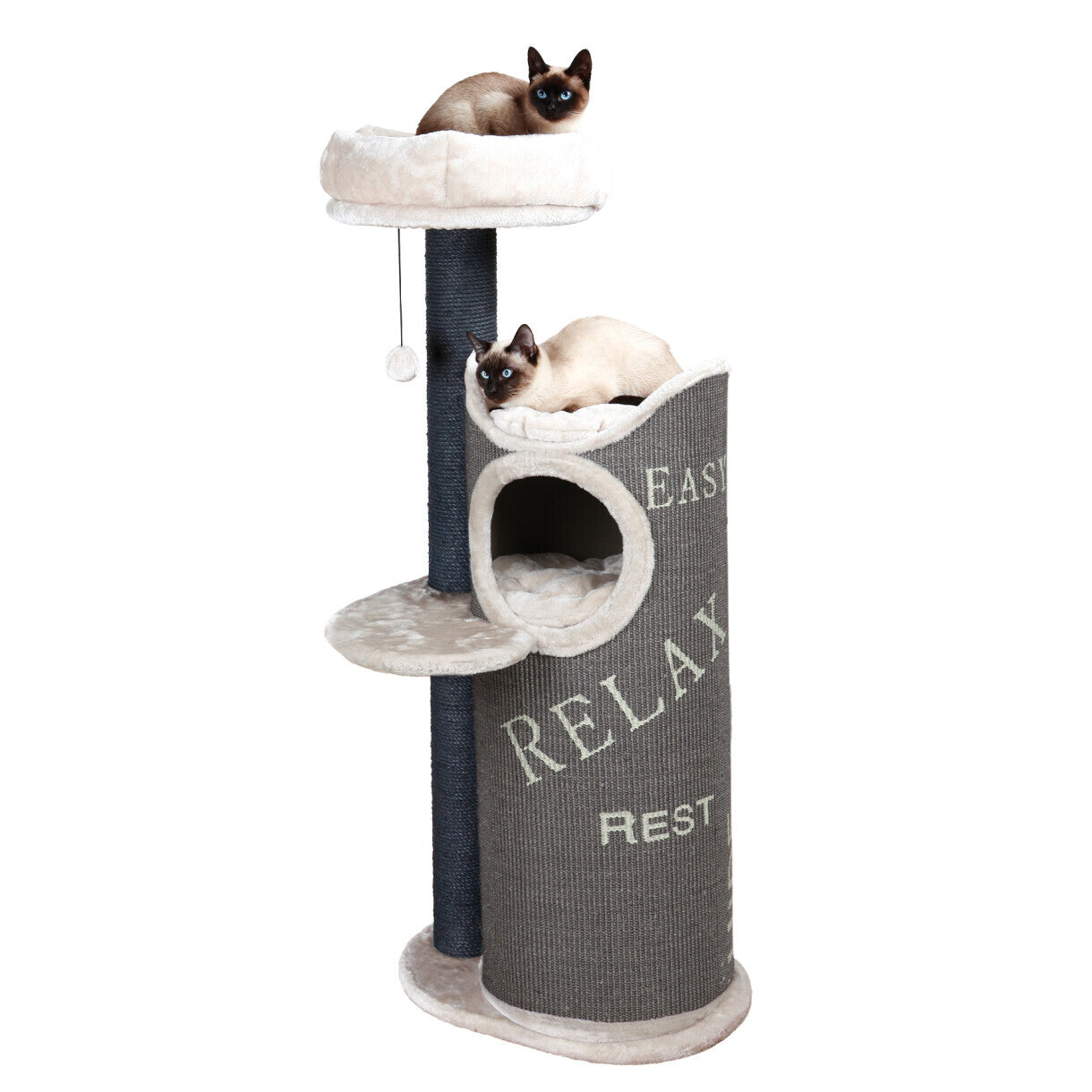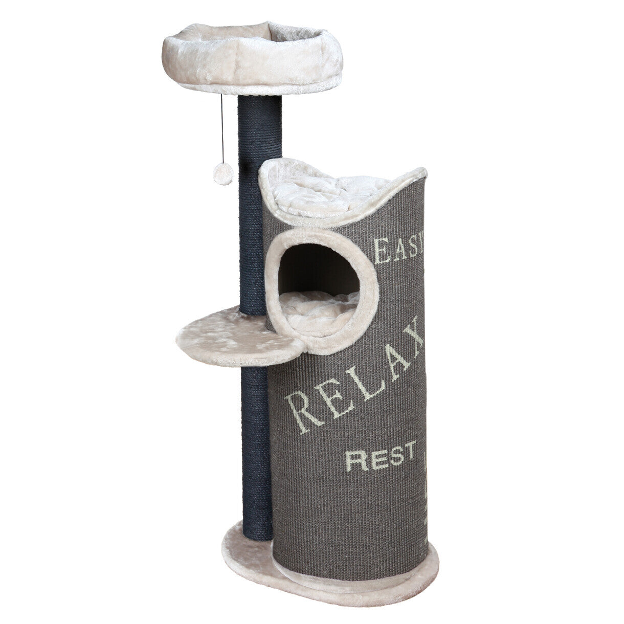 Ovenpå hulen finder du en hyggelig, blød vendepude, og en plysbold med rangle hænger for enden af en nylonsnor og indbyder til leg. Katte, der ønsker at komme endnu højere op, kan klatre op på det tredje niveau. Her kan man ligge på en blød seng, hvor din kat kan læne sig op af. Samtidig er det en udsigtsplatform, hvor man kan beskue sit rige. Kradsetræet er holdt i grå og lysegråt, og er forsynet med påskriften "Relax", "Easy Living", "Rest" og "Hide". Et flot kattetræ, der er en berigelse i ethvert kattehjem!