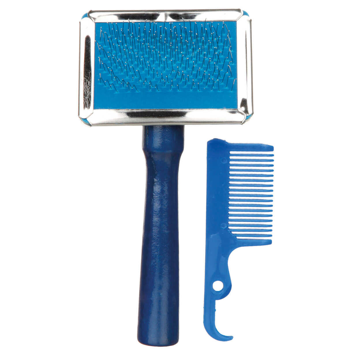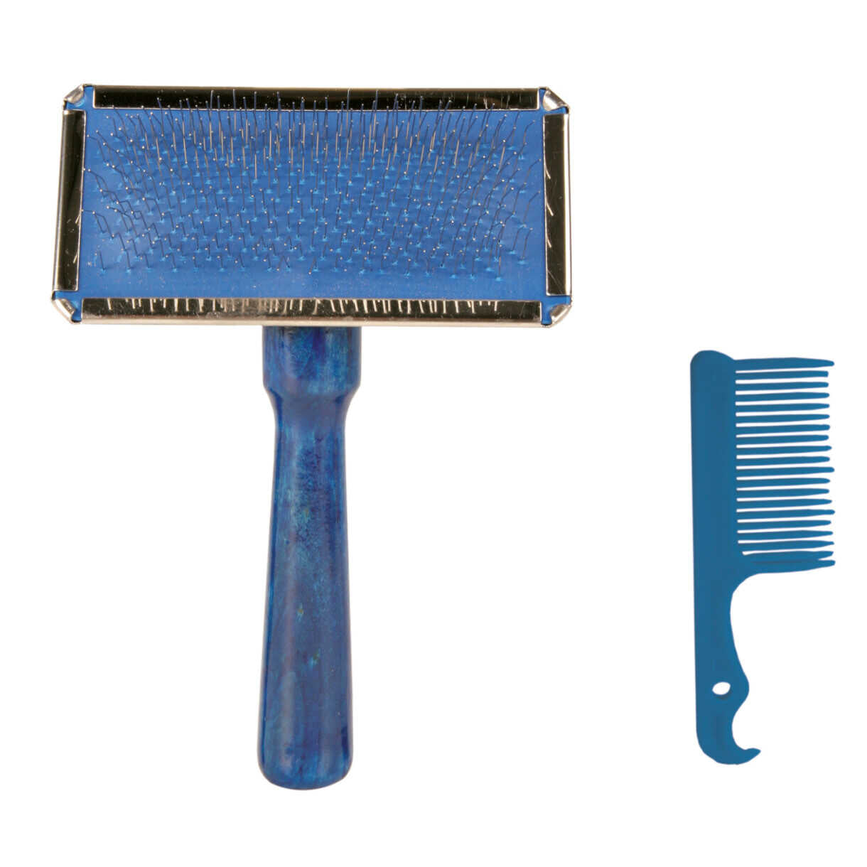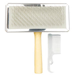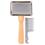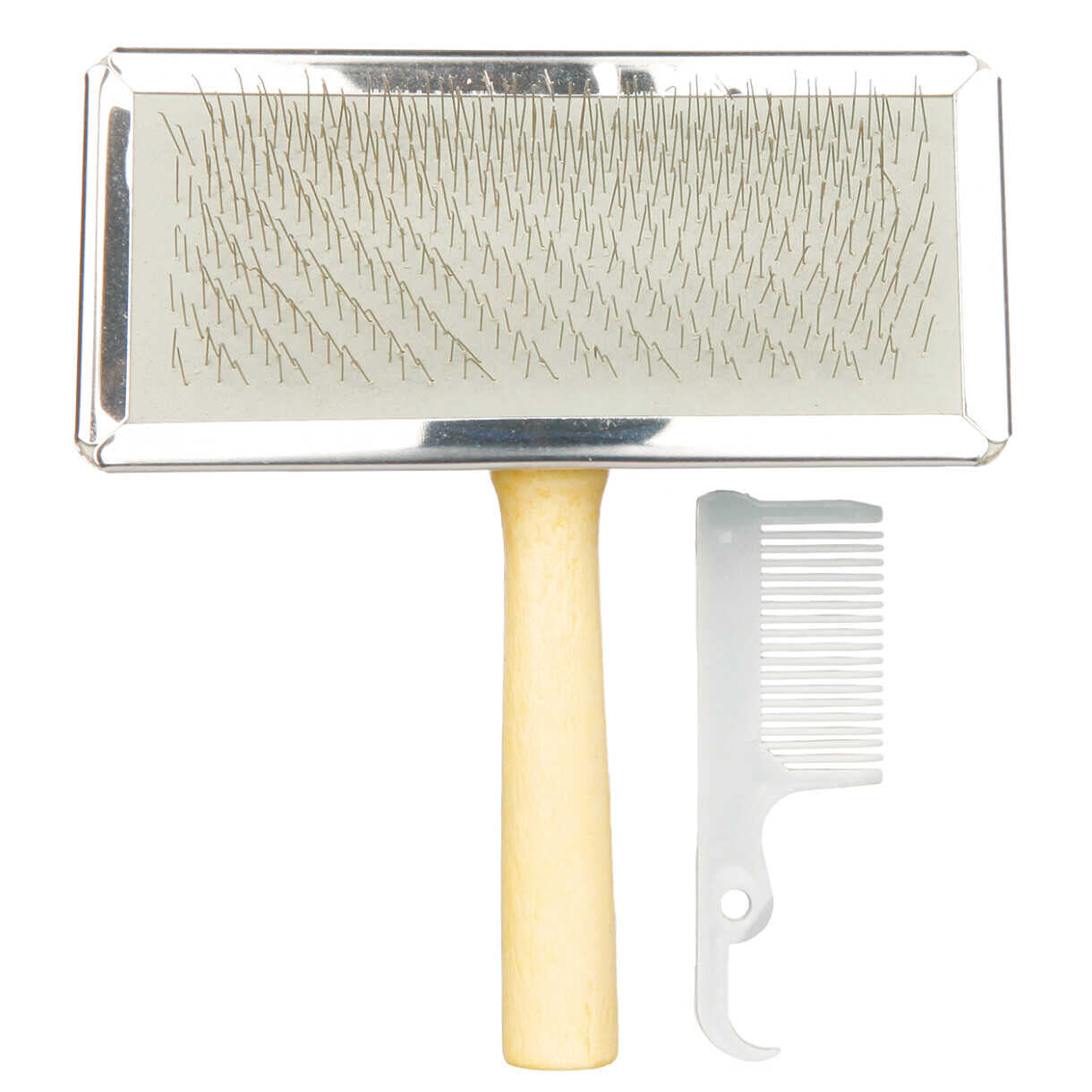Karten med træskaft er et praktisk redskab til at pleje hundens pels. Den har bløde metalbørster, der effektivt fjerner løse hår og udreder filtret pels. Den leveres med en rensekam, der gør det let at fjerne hårene fra karten efter brug, så den altid er klar til næste gang. Med sit ergonomiske træskaft ligger karten godt i hånden og giver et behageligt greb under brug.