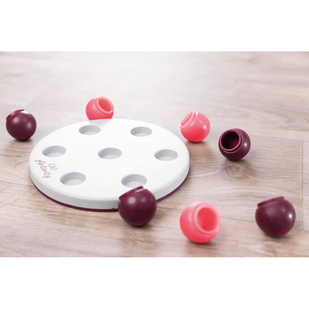 • spillebræt med 7 boldeformede kegler: katten skal bevæge keglerne for at få godbidden