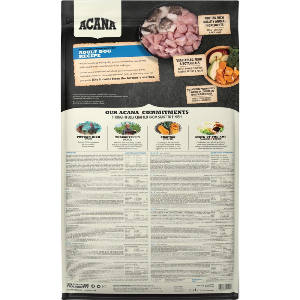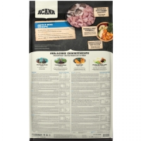 Fersk kylling (13%), kyllingemel (13%), hele røde linser, hele grønne ærter, hele kikærter, ferske kyllingeindvolde (lever, hjerte) (6,5%), kalkunmel (6.5%), kyllingefedt (6%), friske æg (4%), rå kulmule (4%), linsefibre, ærtestivelse, fiskeolie (3%), hele grønne linser, hele gule ærter, sildemel (3%), rå kalkunlever (1%), salt, tørret tang, friske hele æbler, friske hele butternutsquash, friske hele gulerødder, friske hele pærer, friske hele græskar, friske hele squash, friske hele zucchini, friske hele gulerødder, friske hele pærer, friske hele græskar, friske hele zucchini, tørret cikorierod, friske rødbeder, frisk grønkål, frisk spinat, friske majroer, hele blåbær, hele tranebær, hele saskatoonbær, burrerod, lavendel, althearod, marietidsel, hyben, gurkemeje.